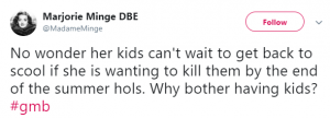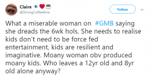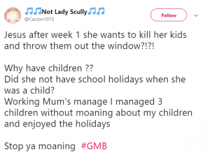 One person wrote on Twitter: “No wonder her kids can’t wait to get back to school if she is wanting to kill them by the end of the summer hols. Why bother having kids?”