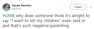 Another ranted: “Why does someone think it’s alright to say ‘I want to kill my children’, even said in jest that’s such negative parenting.”