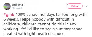 One person wrote: “School holidays [are] far too long with 6 weeks. Helps nobody with difficult in childcare, children cannot do this in any working life!”