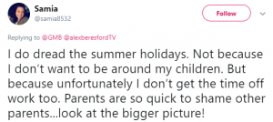 Another tweeted: “I do dread the summer holidays but unfortunately I don’t get the time off work too. Parents are so quick to shame other parents…look at the bigger picture!”