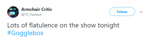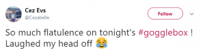 Gogglebox viewers were left in stitches last night after not one, but two of the stars farted during the show.