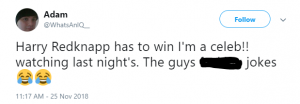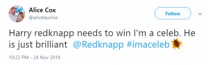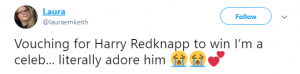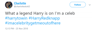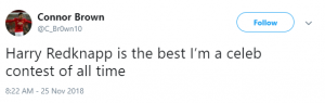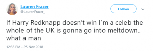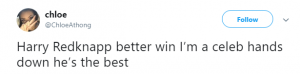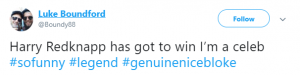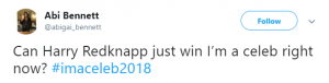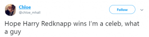 A second agreed writing: “Hope Harry Redknapp wins I’m a celeb, what a guy.”
