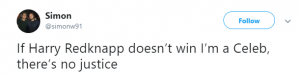 Another fan of the grandfather said: “If Harry Redknapp doesn’t win I’m a Celeb, there’s no justice.”