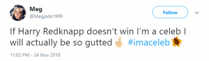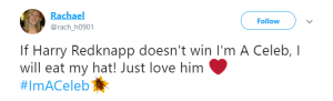 One wrote: “If Harry Redknapp doesn’t win I’m a celeb the whole of the UK is gonna go into meltdown.. what a man.”