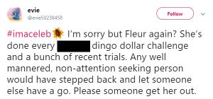 One person wrote: “No way did Fleur do another bushtucker trial last night, becoming a joke how much air time this girl wants, hungry for fame.”