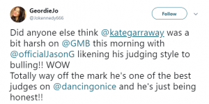 One wrote: “Did anyone else think @kategarraway was a bit harsh on @GMB this morning with @officialJasonG likening his judging style to bulling!! WOW Totally way off the mark.”