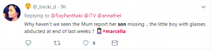 And during last night’s episode, loads of viewers hit upon another major plot stumbling block: why hasn’t the mother of the boy with glasses swiped in the first episode reported him missing?