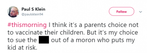 A third added: “Why the hell would you not vaccinate your kids if they’re able to be?! SELFISH #thismorning.”