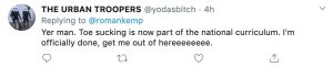 “Toe sucking is now part of the national curriculum. I’m officially done, get me out of hereeeee,” another joked.