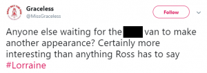 Another wrote: “Anyone else waiting for the [expletive] van to make another appearance? Certainly more interesting than anything Ross has to say #Lorraine.”