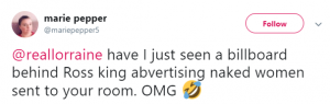 A third added: “@reallorraine have I just seen a billboard behind Ross king advertising naked women sent to your room. OMG.”