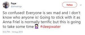 One said: “So confused! Everyone is sex mad and I don’t know who anyone is! Going to stick with it as Anna Friel is normally terrific but this is going to take some time #deepwater.”