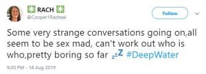 Someone else tweeted: “Some very strange conversations going on, all seem to be sex mad, can’t work out who is who, pretty boring so far #DeepWater.”
