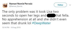 Another said: “The only problem was it took Lisa two seconds to open her legs and [bleep] that fella. No apprehension at all and she didn’t even seem that drunk lol #DeepWater.”