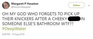 “Oh my god, who forgets to pick up their knickers after a cheeky [bleep] in someone else’s bathroom wtf?” tweeted a fifth.