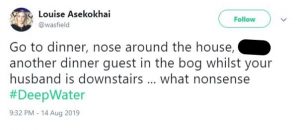 A sixth viewer put: “Go to dinner, nose around the house, [bleep] another dinner guest in the bog whilst your husband is downstairs… what nonsense #DeepWater.”