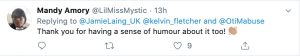 “Thank you for having a sense of humour about it too!” a third wrote.