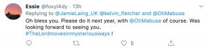 Finally, a follower commented: “Oh bless you. Please do it next year, with @OtiMabuse of course. Was looking forward to seeing you.”