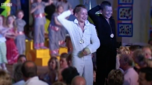It showed AJ and his Love Island star brother dressed in 70s-style catsuits as they performed a dance routine to the Bee Gee’s Saturday Night Fever during a school play.
