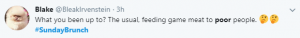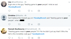 Tim replied: “Usual stuff, lots of teaching, working with a charity, feeding game meat to poor people… or people who are in need of food.