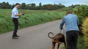 The Take That singer is dragged along by his powerful pet as he struggles to demonstrate to Channel 4’s Supervet, Noel Fitzpatrick, how the pooch is limping.