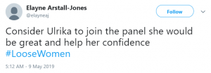 Someone else tweeted: “Just watched Ulrika on #LooseWomen, she would be a brilliant panelist. Loads of life experience. A good addition to a brill show.”