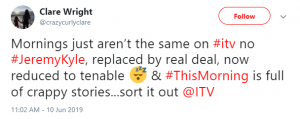 One angry telly fan said: “Mornings just aren’t the same on #ITV no #JeremyKyle, replaced by Real Deal, now reduced to Tenable & #ThisMorning is full of crappy stories… sort it out @ITV.”