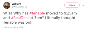 Another tweeted: “WTF! Why has #Tenable moved to 9:25am and #RealDeal at 3pm? I literally thought Tenable was on!!”