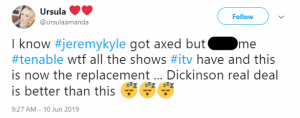 A third wrote: “I know #JeremyKyle got axed but [bleep] me #Tenable wtf. All the shows #ITV have and this is now the replacement… Dickinson’s Real Deal is better than this.”