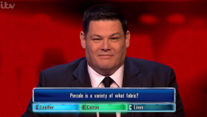Mark, who is known as The Beast on the show, and contestant Leon were asked: “Percale is a variety of what fabric?” followed by three choices of answers – leather, cotton or linen.