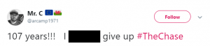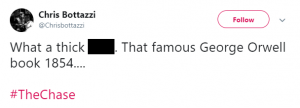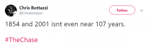 Another said: “1854… That famous book by Orwell,” while a third tweeted: “107 years!!! I [expletive] give up #TheChase.”