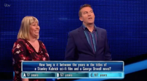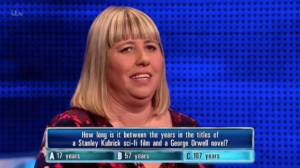 Host Bradley Walsh asked her: “How long is it in between the years in the titles of a Stanley Kubrick sci-fi film and a George Orwell novel? A. 17 years. B. 57 years. C. 107 years.”