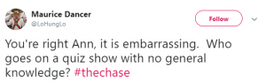 A fourth added: “1854 and 2001 isn’t even near 107 years. #TheChase,” while another said: “You’re right Ann, it is embarrassing. Who goes on a quiz show with no general knowledge?”