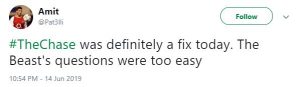 One branded the show “a fix” and said: “#thechase was definitely a fix today. The Beast’s questions were too easy.”