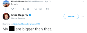 When one fan jokingly replied; “Prove it,” Anne’s sense of humour really came out when she retorted: “My [bleep] are bigger than that.”