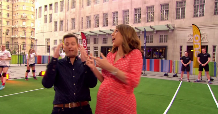 Matt, 41, and co-host Alex Jones were presenting a segment on Team GB’s dodgeball squad, as they practised in the background.