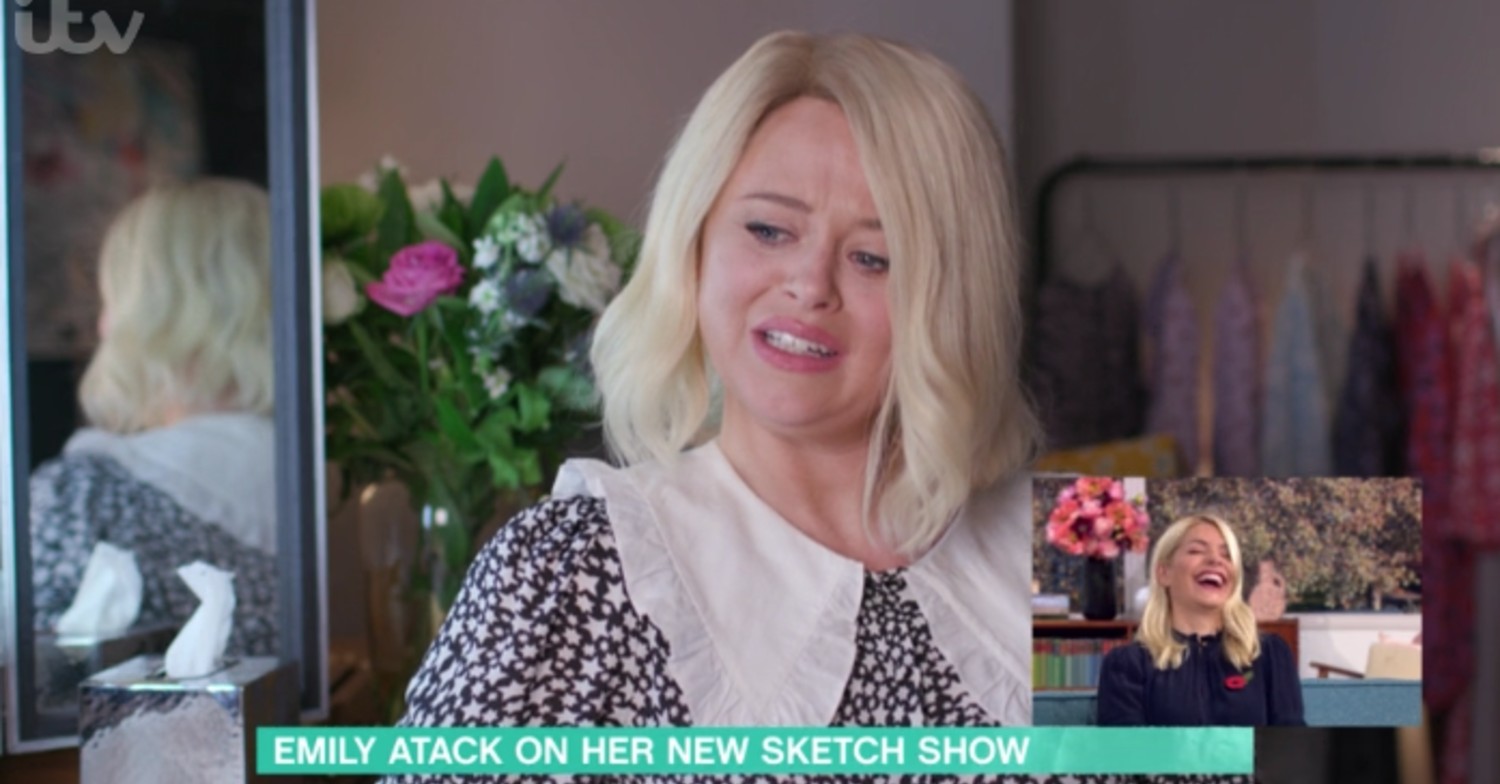 The 39-year-old presenter couldn’t contain her laughter after watching a clip from Emily’s new ITV2 comedy show.