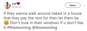 One person wrote: “If they wanna walk around naked in a house that they pay the rent for then let them be.”