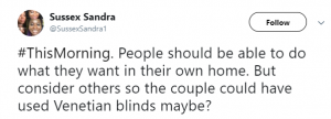 Karin explained: “On Friday, we had a note put through our letterbox to say that they were sick of seeing various parts of us in our house and they asked us to close our blinds or they would report us to the police.”