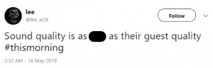 Another remarked: “Sack the sound guy, [bleeping] amateur! #thismorning.”