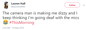 A third viewer tweeted: “The camera man is making me dizzy and I keep thinking I’m going deaf with the mics. #ThisMorning.”
