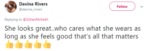 A third tweeted: “She looks great..who cares what she wears as long as she feels good that’s all that matters.”