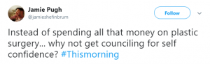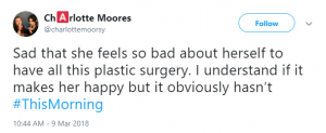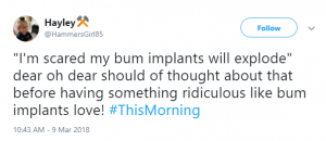 One said: “I’m scared my bum implants will explode” dear oh dear should of thought about that before having something ridiculous like bum implants love! #ThisMorning.”