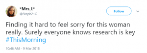 A third wrote: “Finding it hard to feel sorry for this woman really. Surely everyone knows research is key #ThisMorning.”