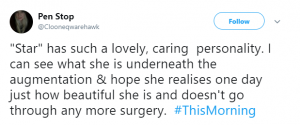 One tweeted: “Star has such a lovely, caring personality. I can see what she is underneath the augmentation & hope she realises one day just how beautiful she is and doesn’t go through any more surgery. #ThisMorning.”