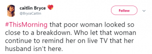 One person said: “#ThisMorning that poor woman looked so close to a breakdown. Who let that woman continue to remind her on live TV that her husband isn’t here.”