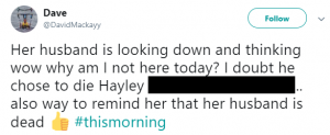 Another wrote: “Her husband is looking down and thinking wow why am I not here today? I doubt he chose to die Hayley.. also way to remind her that her husband is dead #thismorning.”