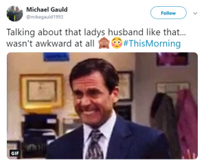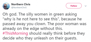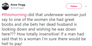 A fourth ranted: “#thismorning – did that underwear woman just say to one of the women she had great boobs and she bets her dead husband is looking down and wishing he was down here???