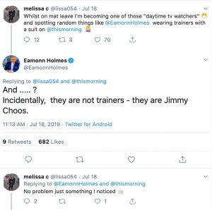 The viewer wrote: “Whilst on mat leave I’m becoming one those ‘daytime tv watchers’ and spotting random things like @EamonnHolmes wearing trainers with a suit on #thismorning” followed by a woman shrugging emoji.
