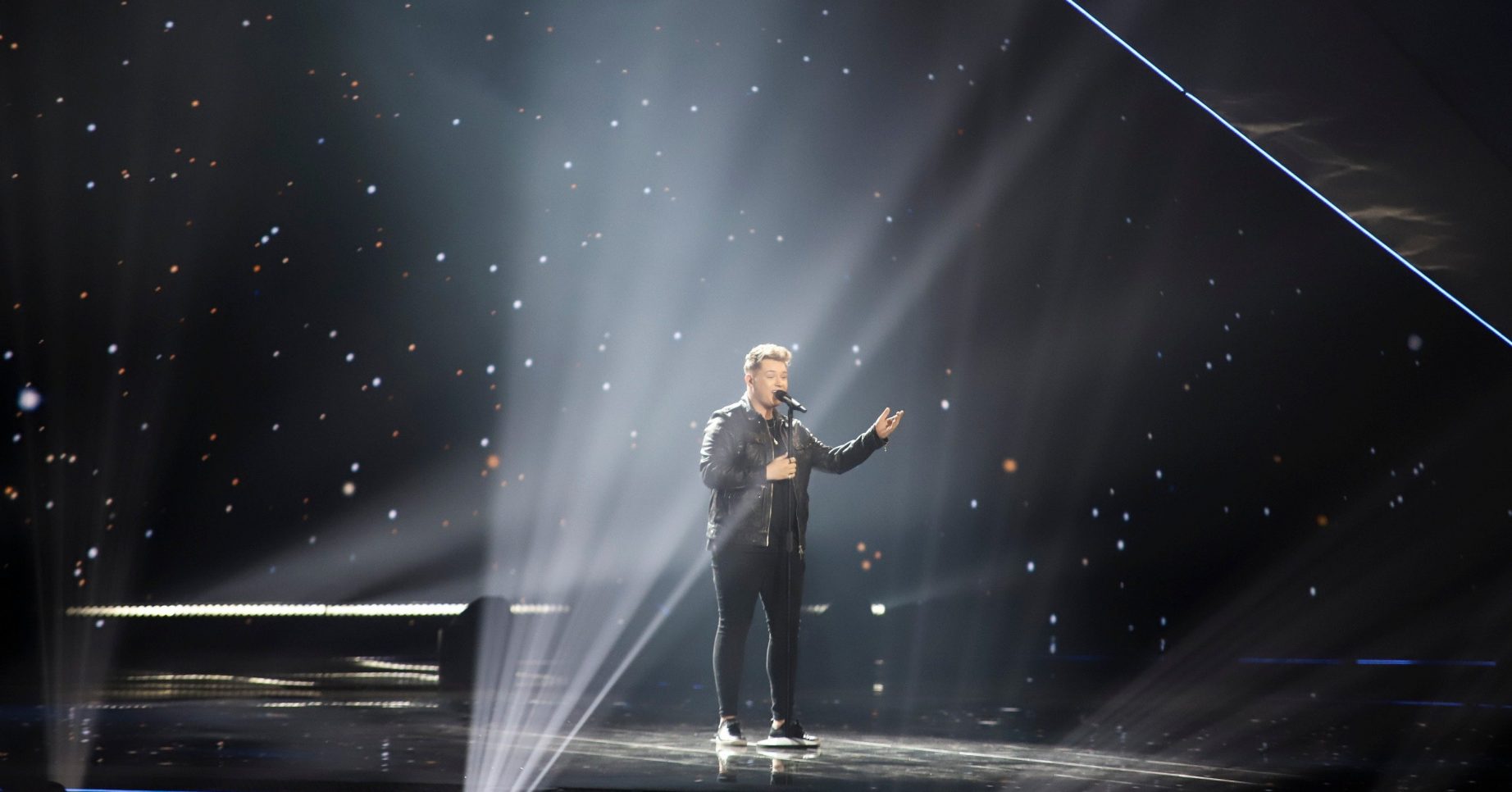 Hartlepool native Rice sang Bigger Than Us at the Expo Tel Aviv venue in Israel against a backdrop of a starry night sky and racing comets.